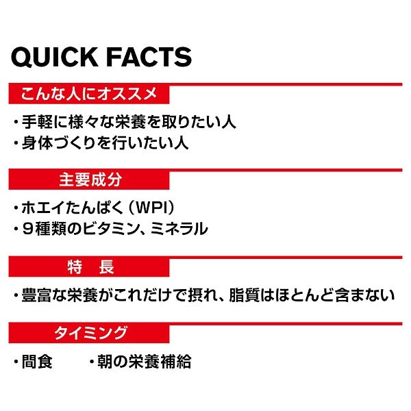 筋肉を喜ばせる高品質なホエイたんぱくが20g、エネルギーとなる炭水化物が22g、身体の機能を調節するビタミン・ミネラルが9種類と、豊富な栄養が詰まっていて、アスリートが望むべき栄養摂取を簡単に実現させてくれる。