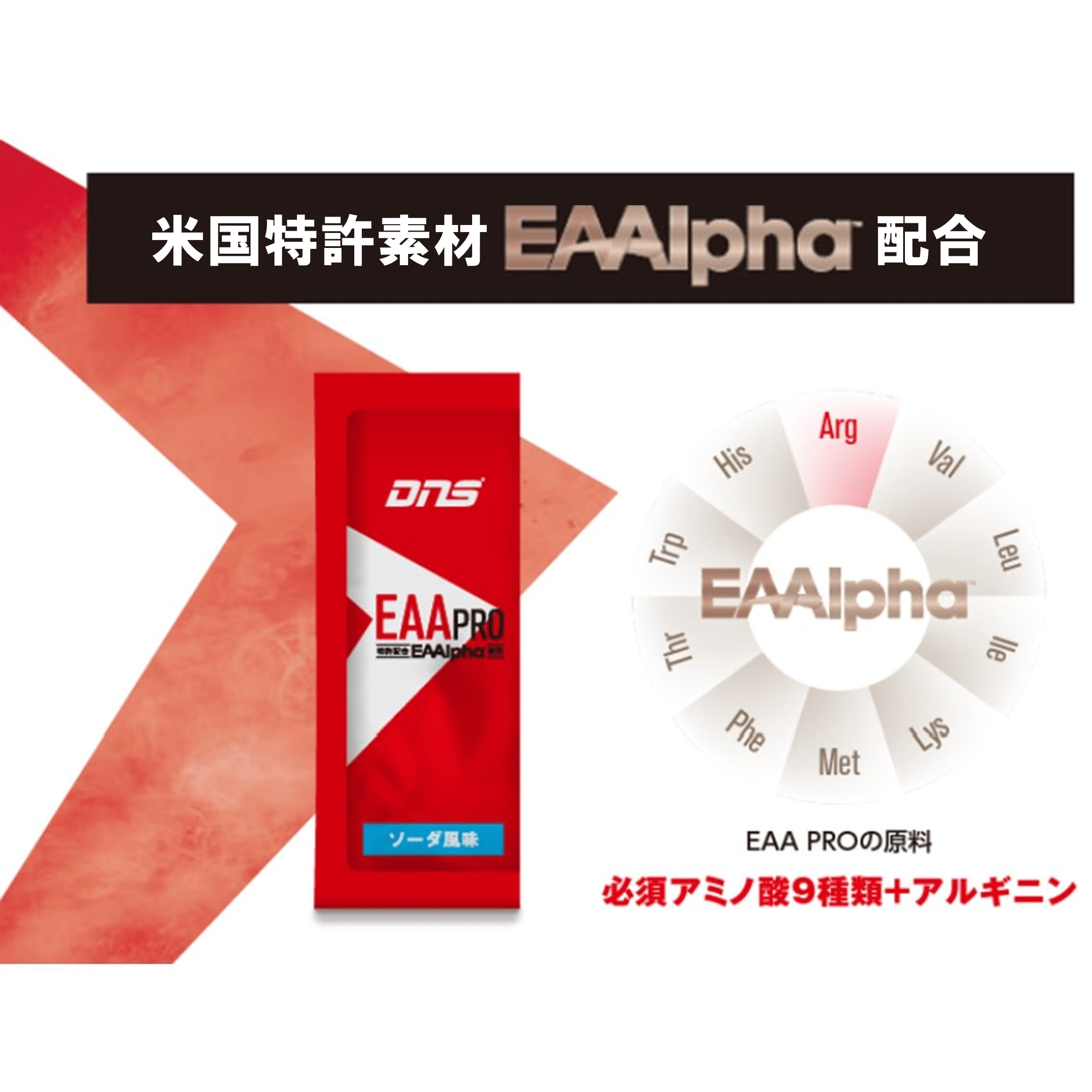 そもそもEAAとは、Essential Amino Acidsの頭文字で、ヒトが体内で作ることのできない9種類のアミノ酸、必須アミノ酸のことを指す。EAAは、プロテインと同じく身体作りに非常に重要であることが数多くの研究からわかっているが、EAA PROは、この9種類の必須アミノ酸にアルギニンが加わった、EAAlpha(イーエーエーアルファ)という、米国特許を取得した画期的なEAA素材を原料に使用している。鍛える前に、飲め